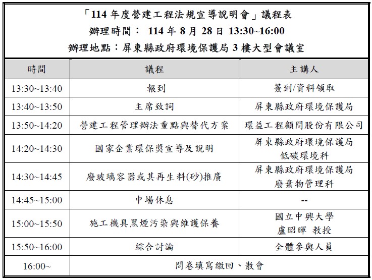 屏東縣政府環境保護局自營建工程管理辦法發布以來,每年均召開教育宣導會,積極邀請縣轄內營建工程發包與施工等單位與會,向其說明營建工地相關污染防制措施及管理辦法法令規範。本次宣導會主要以營建工程管理辦法與營建工程施工機具為主要議題,擬藉此機會向與會者介紹法規及施工機具黑煙污染與維護保養內容,期能讓與會業者對相關法規及施工機具自主管理標章與維護保養有更深一層的認識。
